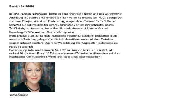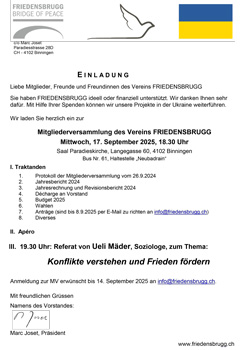 Der Verein Friedensbrugg ist eine kleine, in der Region Basel verankerte Organisation. Wir gründeten die Friedensbrugg vor 33 Jahren, als der Krieg auf dem Balkan begann. Der Unparteilichkeit und Gewaltlosigkeit verpflichtet führten engagierte Fachleute unserer Region seither über 100 Workshops und Seminare in Kroatien, Serbien, Mazedonien und in Bosnien/Herzegowina durch, seit 2015 auch in der Ukraine.