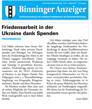 Vor 4 Jahren ist der Krieg in der Ukraine uns nah gekommen – zu uns in die Fernsehstuben und Tausende von Flüchtlingen zu uns in die Unterkünfte. Aber im Osten der Ukraine ist schon seit zwölf Jahren Krieg. Damals weitete der Verein Friedensbrugg seine Aktivitäten in die ukrainische Stadt Charkiv aus, wo die Fluchtbewegung aus dem Donbass, dem nahen Kriegsgebiet im Osten, besonders dramatisch war.